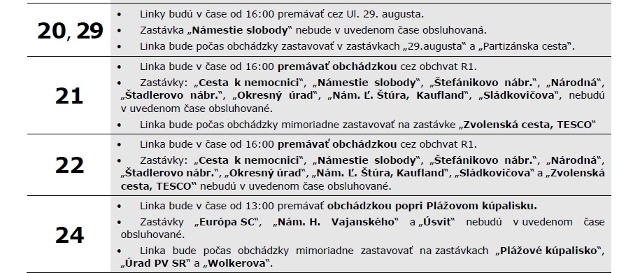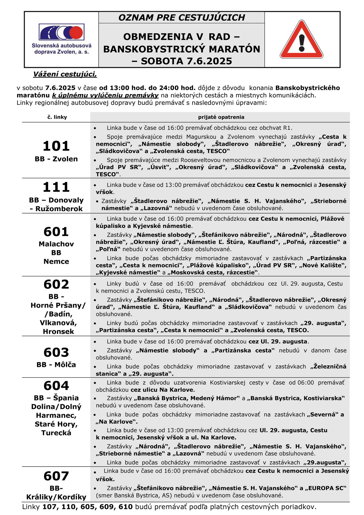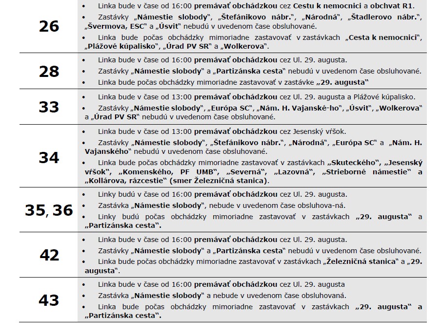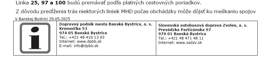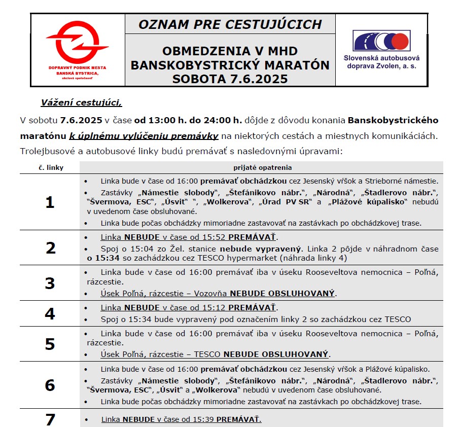 Vážení cestujúci, v sobotu 7. 6. 2025 dôjde z dôvodu konania Banskobystrického maratónu v čase od 13:00 do 24:00 k úplnému vylúčeniu premávky na niektorých cestách a miestnych komunikáciách. Trolejbusové a autobusové linky budú premávať s nasledovnými úpravami: