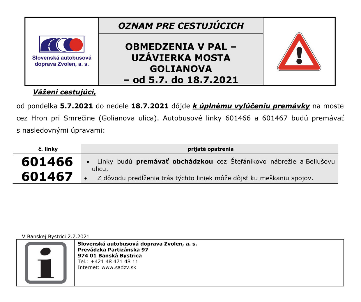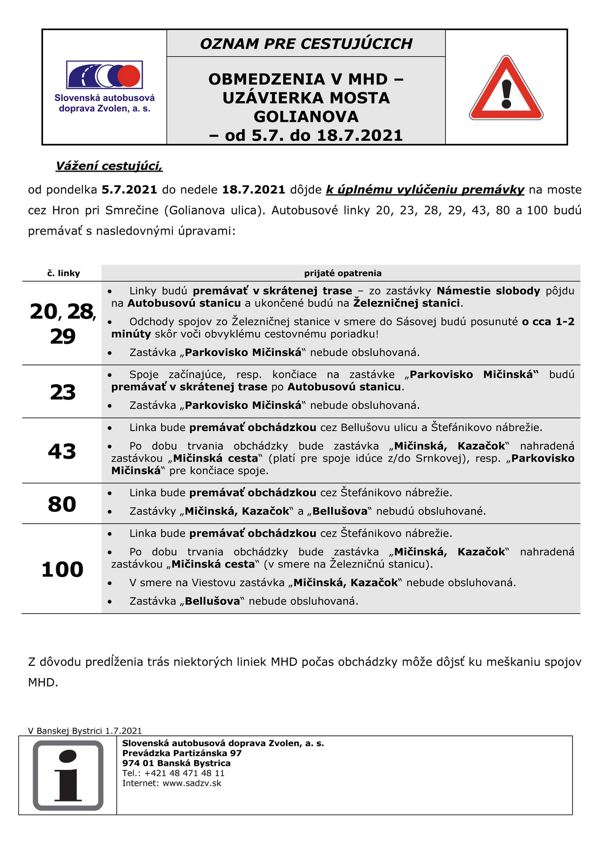 Vážení cestujúci, od pondelka 5. 7.2021 do nedele 18. 7. 2021 dôjde k úplnému vylúčeniu premávky